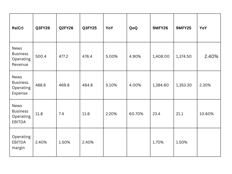 Network18 delivered a steady performance in Q3 FY26, reporting a 5% year-on-year rise in operating revenue to ₹500 crore, even as the broader advertising market remained subdued. The growth was achieved against an industry backdrop where TV news advertising inventory demand declined by over 10% year-on-year, highlighting the network’s relative resilience.