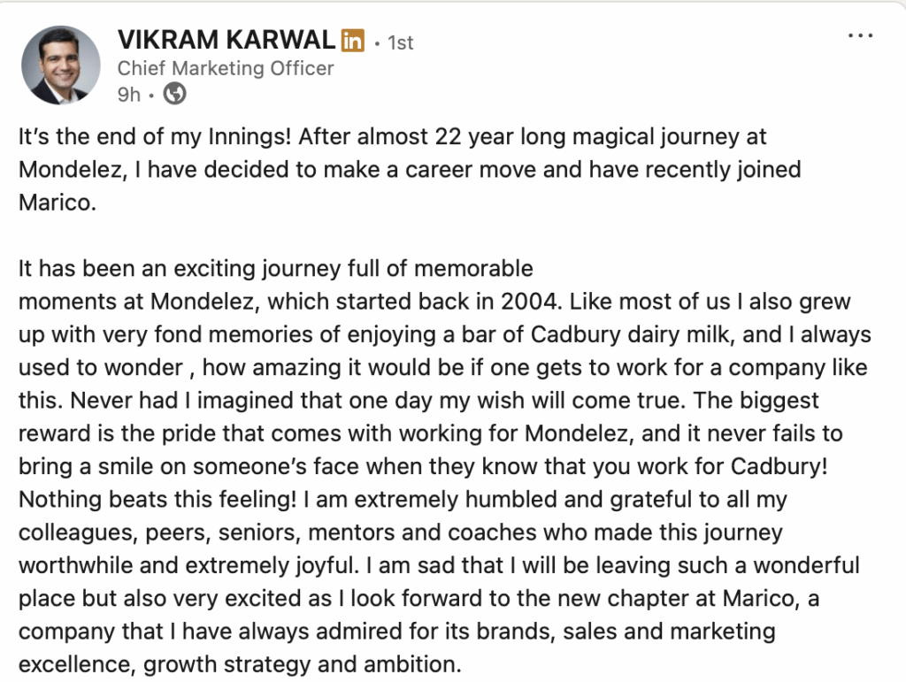 Vikram Karwal has announced a major career transition, bringing an end to an almost 22-year-long association with Mondelez and beginning a new chapter at Marico.